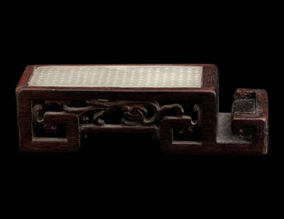 the jade sword fitting decorated with raised bosses, set in the hardwood stand pierced and carved with kui dragons.