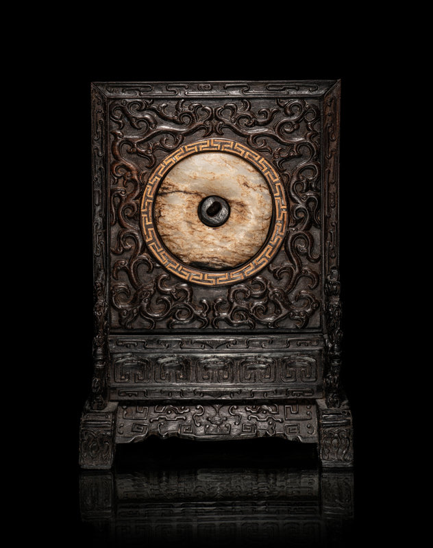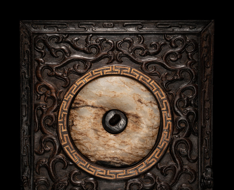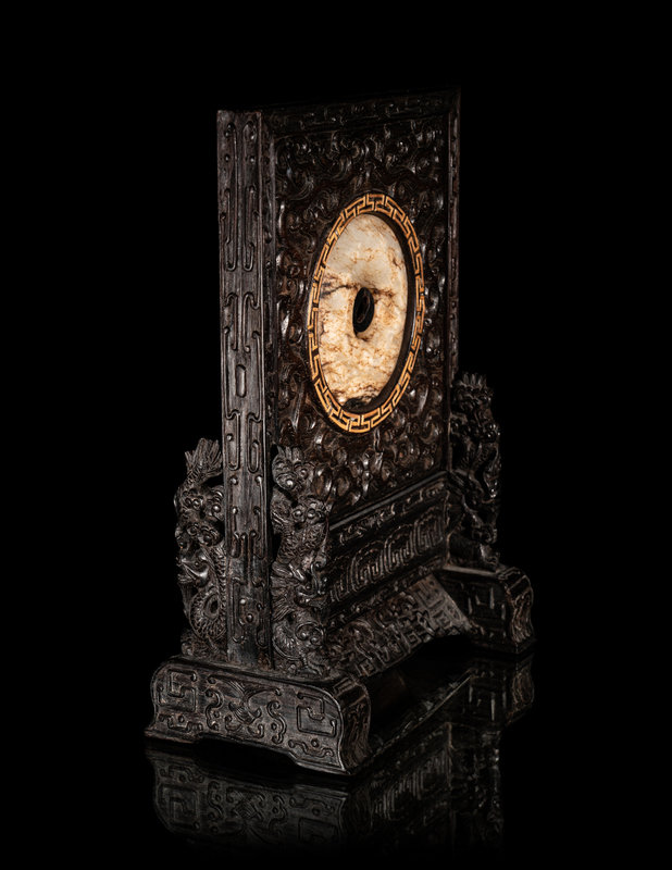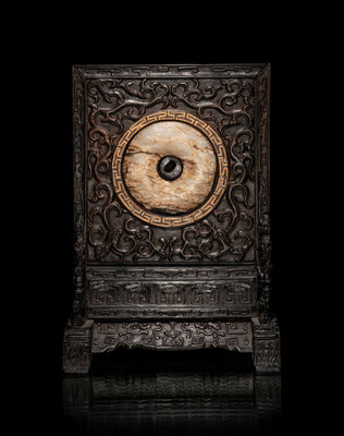 A Chinese Jade Bi Disc Inset Hardwood Table Screen