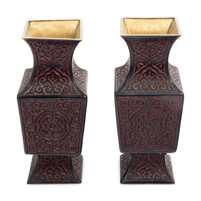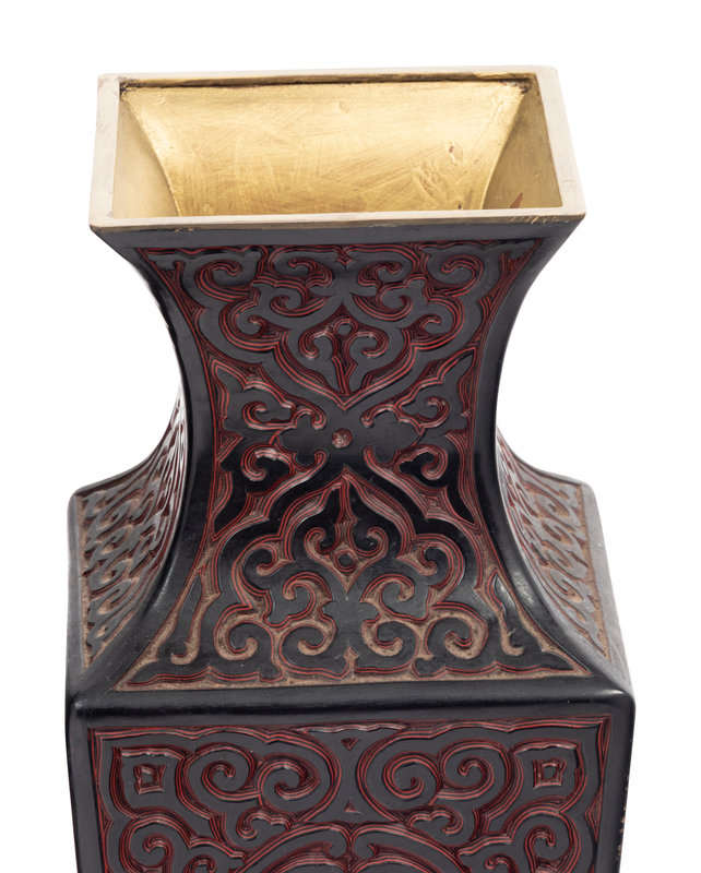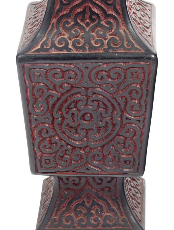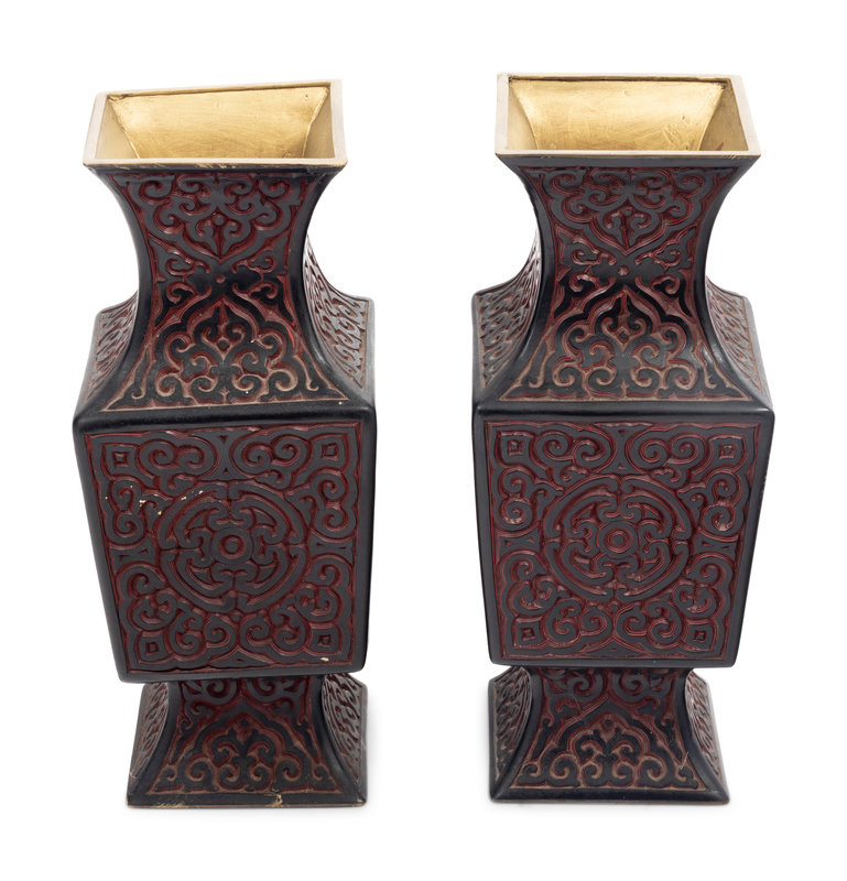 each of square section, having a splaying foot narrowing to support the sectioned body beneath a sloping neck and even mouth rim; decorated with alternating layers of black and red lacquer, deeply carved with a dense network of pommels and 'c' scrolls.