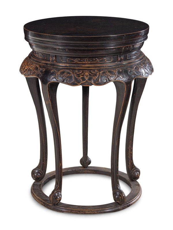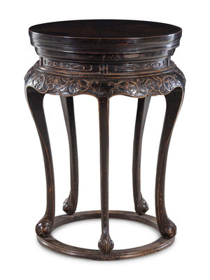 the circular paneled top supported a curved narrow waist, the apron carved in high-relief with with floret scrolls, the slender cabriole legs terminating in upward curling tendril feet set into a foot ring.