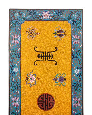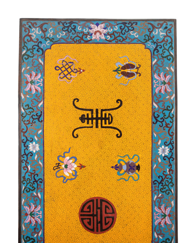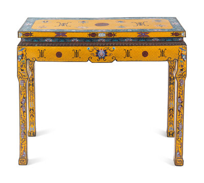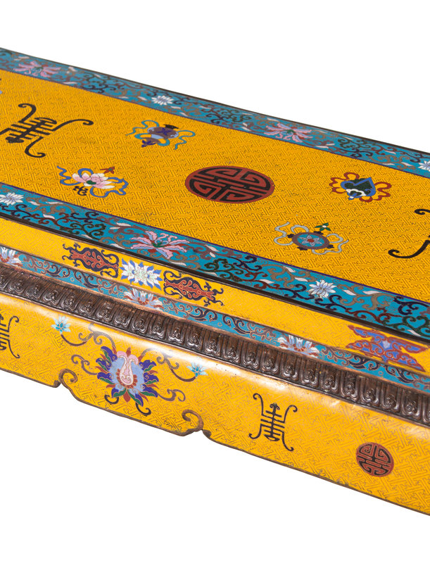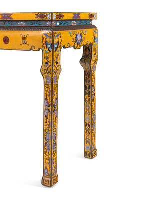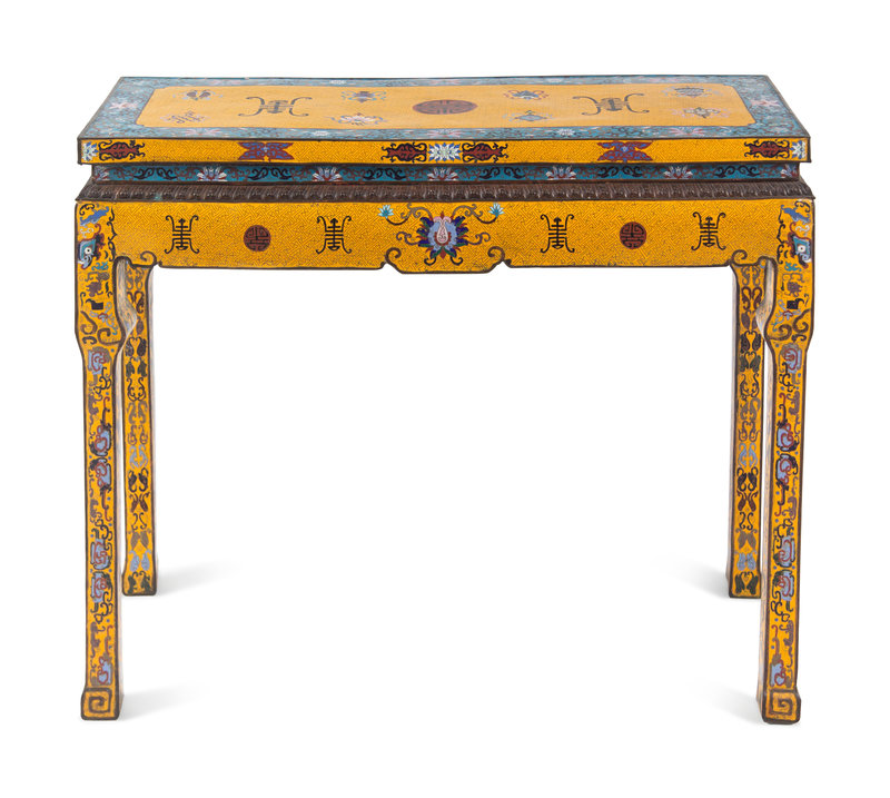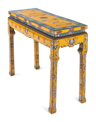 the rectangular top raised on a recessed waist above shaped aprons and square legs ending in hoof feet, the top panel decorated with a central shou medallion and two shou characters, divided by ribbon-tied Buddhist emblems, all reserved on a bright yellow ground with interlocking T motif, the border decorated with lotus scrolls on a celeste blue ground, the aprons and legs having similar shou, lotus sprays and melon decoration.
