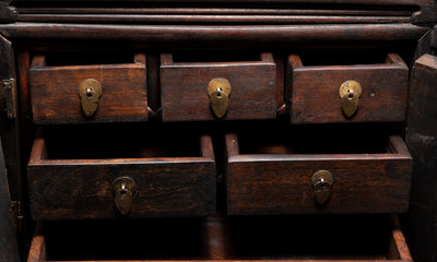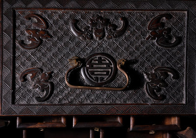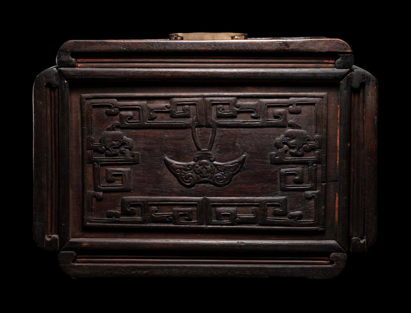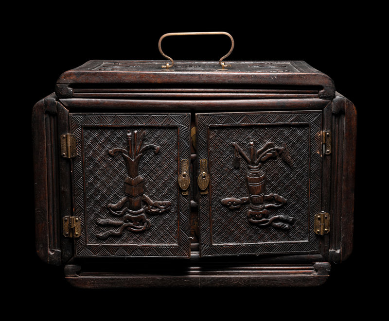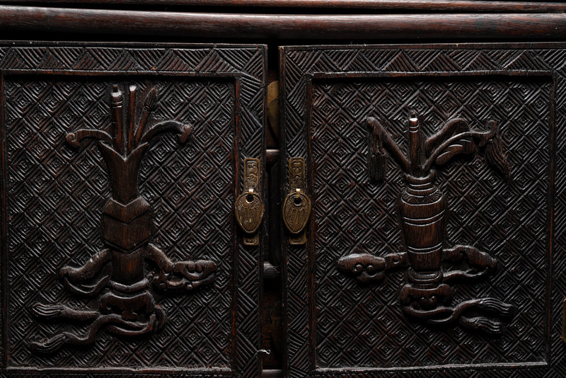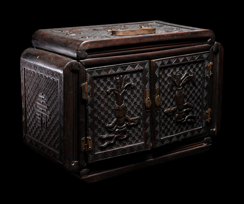 of rectangular form, having a pair of pull-out doors each carved in relief with scholar's objects against a leiwen ground, opening to multiple drawers, the top panel carved with bats above shou roundels.