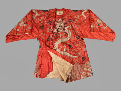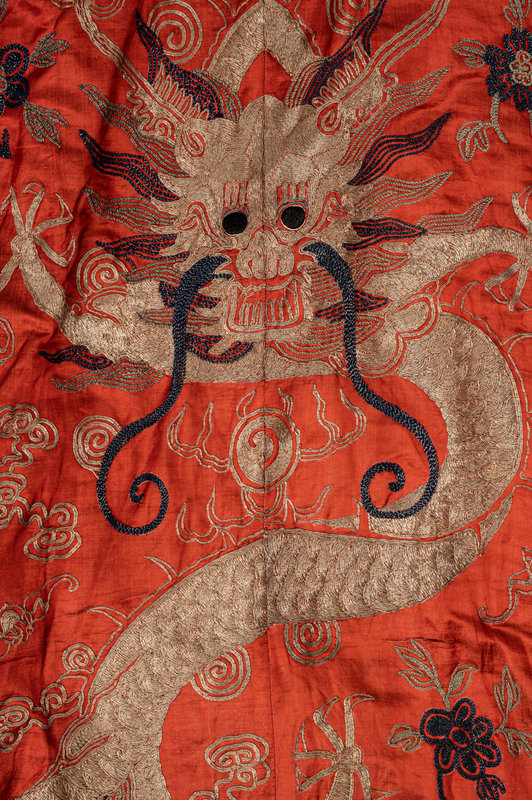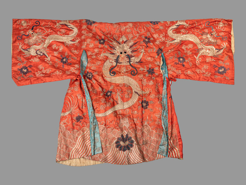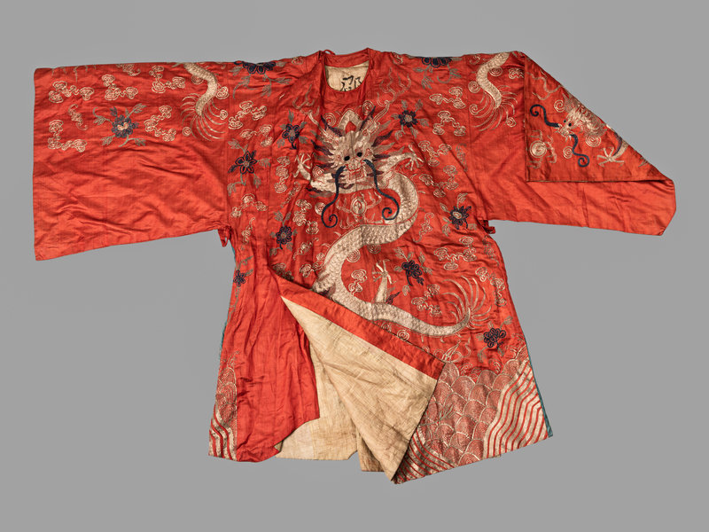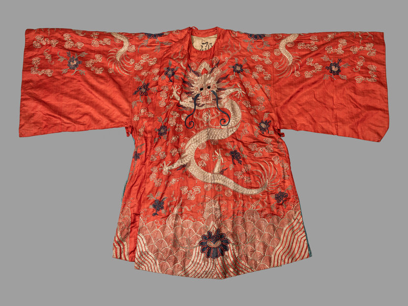 tailored from deep permission silk with wide sleeves and a side closure, embroidered with polychrome and metallic threads to show writhing dragons.