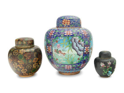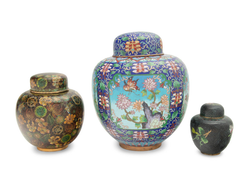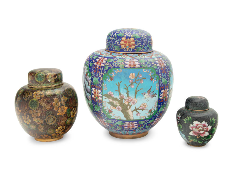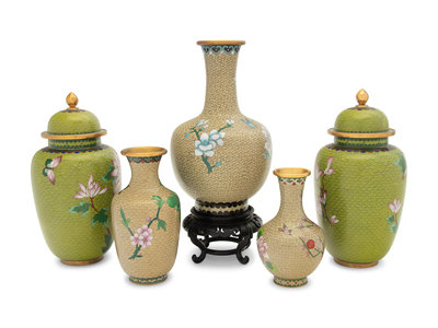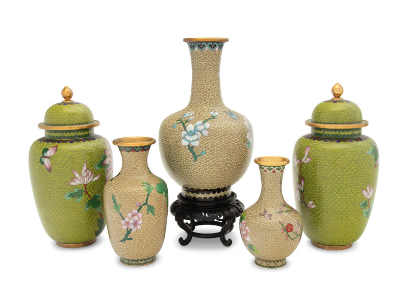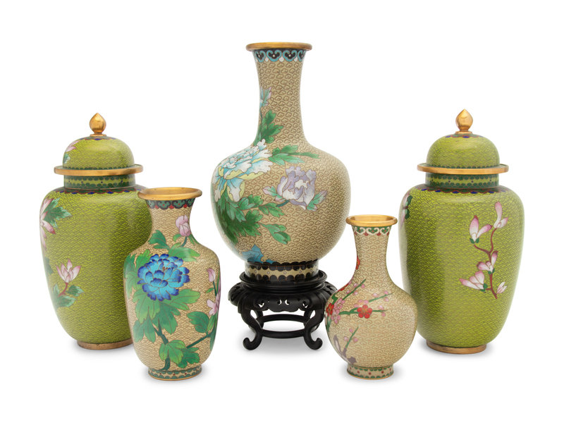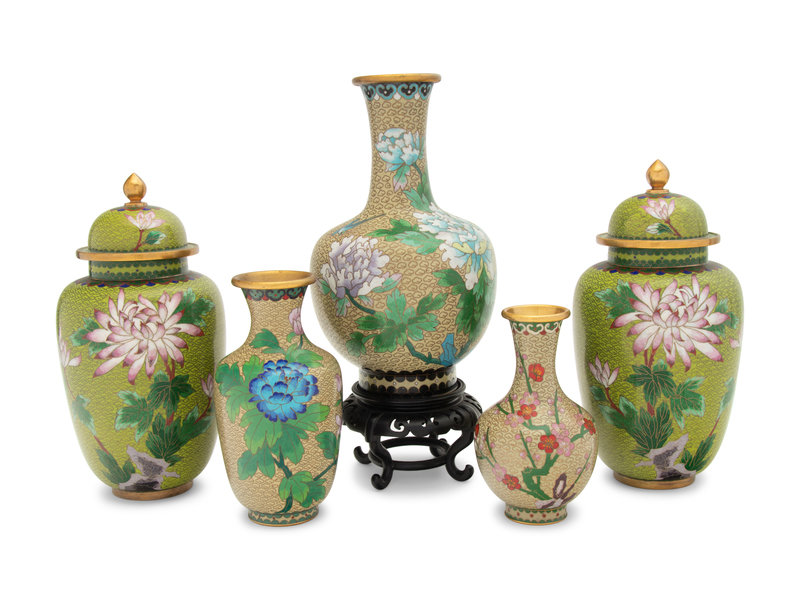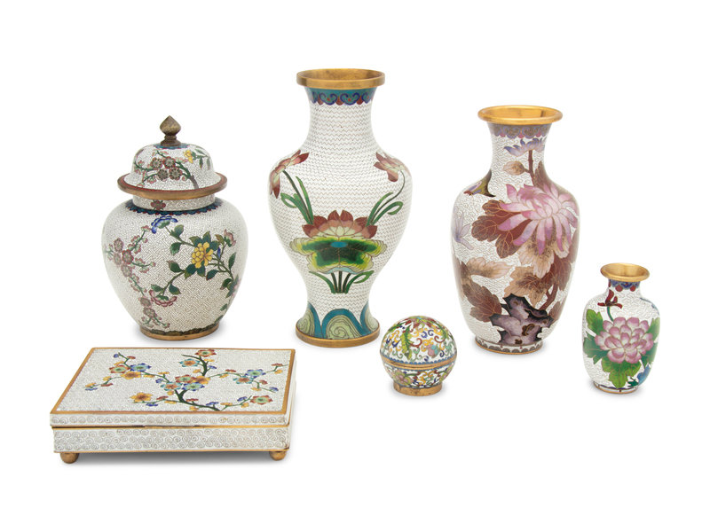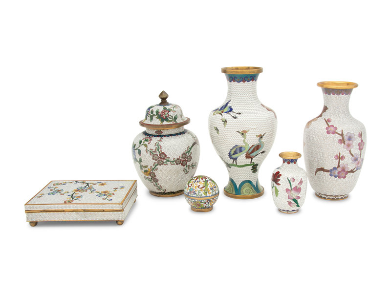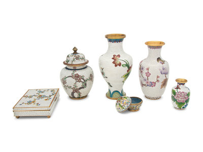 comprising a pair of covered jars, a baluster vase, and two bottle vases, the larger of which with an associated hardwood stand. Each worked to show various chrysanthemum, peony, and prunus against a light green ground of gilt wires forming puffy cloud scrolls, also comprising three baluster vases, one covered jar, one rectangular box, and one petite spherical box, all on white ground, together with three covered jars.