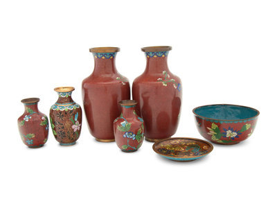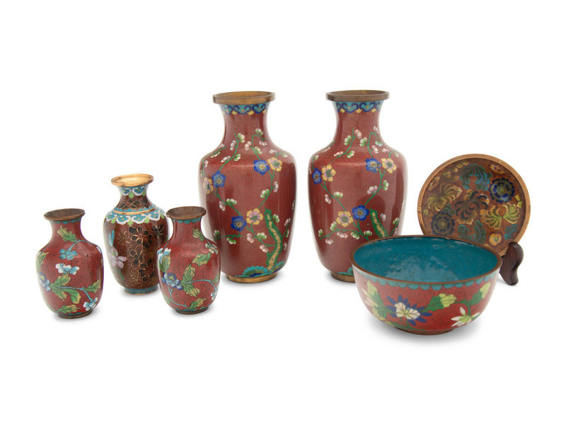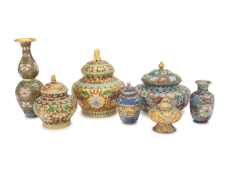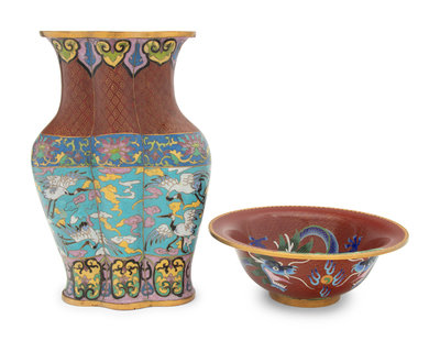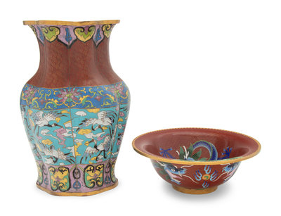 comprising a gourd-form vase, four covered jars, and one baluster vase worked with radiant lotus heads and scrolls, and one covered jar with a millefleur pattern, two pairs of baluster vases, each decorated with a network of blossoming branches, two 'millefleur' articles, one saucer, and one vase, and one small bowl; a lobed vases, divided between an upper registers of repeated lozenges formed from gilt wires and a lower register of flying cranes by a lotus band. The second a large bowl with a flaring mouth rim, decorated against the cloud-strewn ground with writhing dragons.