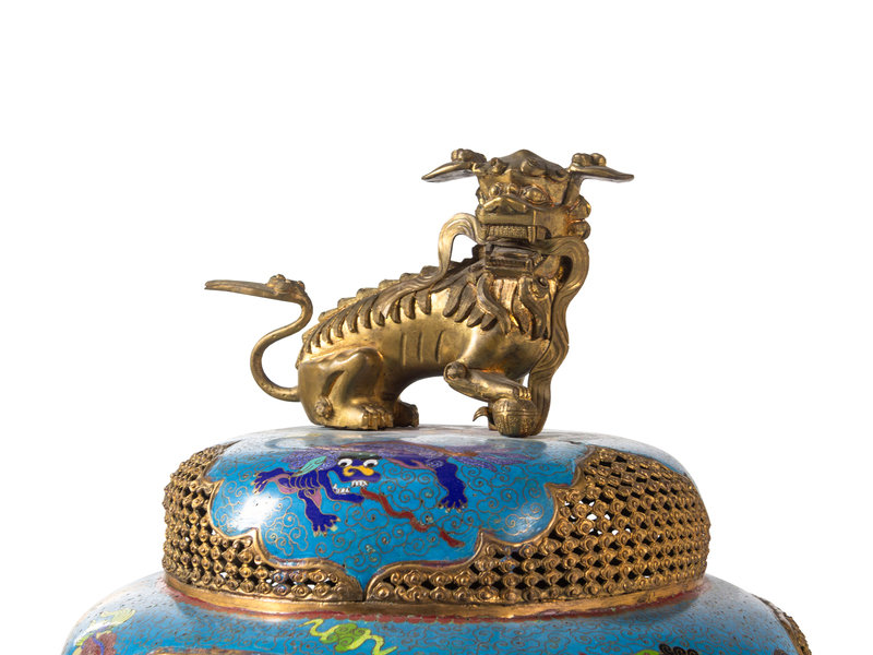 the globular body raised on three elephant-form legs, decorated all over with mythical beasts traversing a turquoise ground of scrolling clouds, surmounted by rounded tiered covered decorated en suite, the whole topped with a beast-form finial.