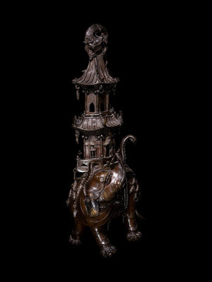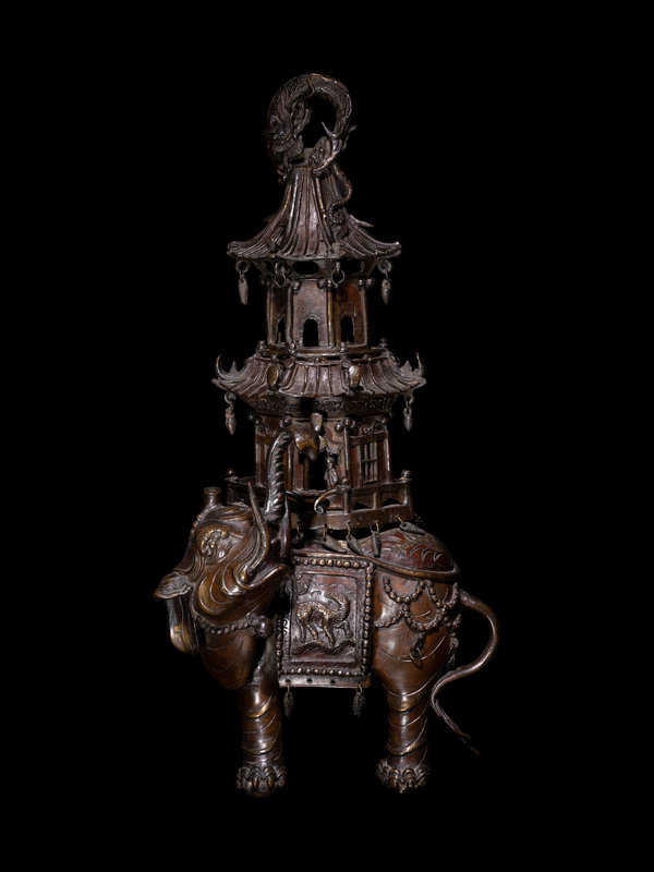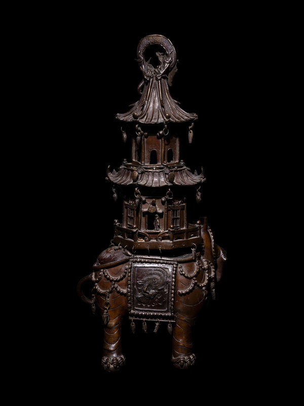the base formed as the tusked creature standing foursquare above stour legs and clawed toes, casting its gaze and curling probiscis upward at tiered pagoda with pendent roof tiles forming the a cover across its back, the whole with deep patina and traces of gilt.