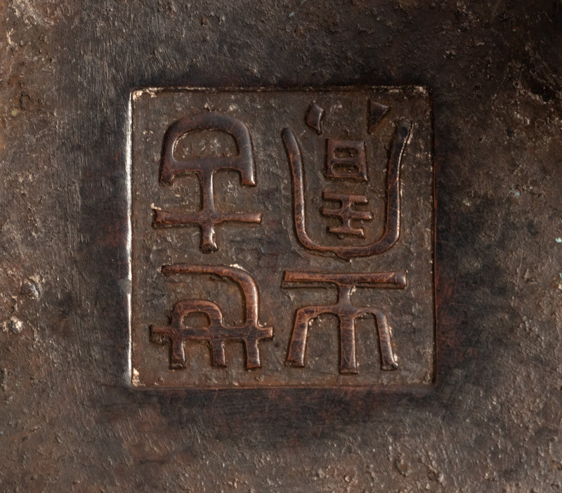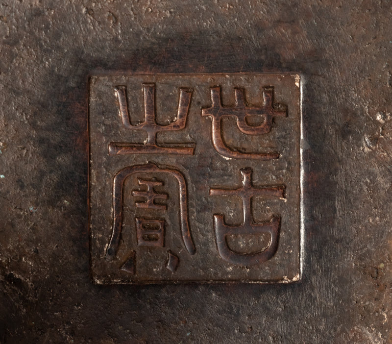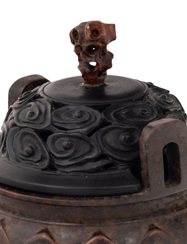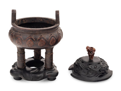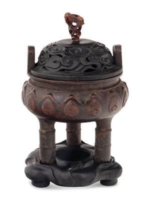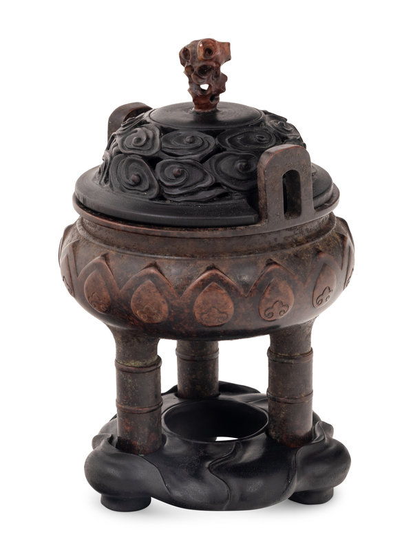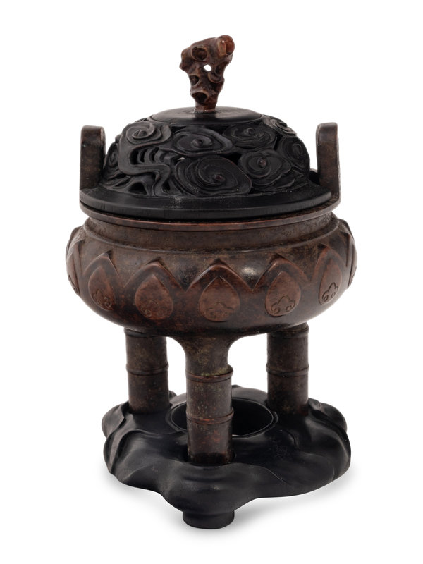 the compressed rounded body worked with patinated petal lappets rounding the circumference, all supported by cylindrical legs resting in a conforming hardwood stand and surmounted by a carved wood cover nestled between the vessels' inverted u-form handles.