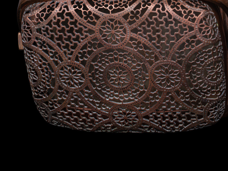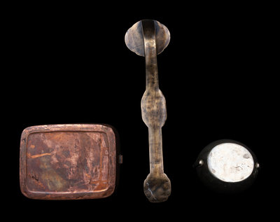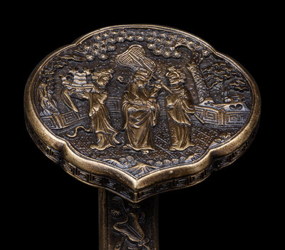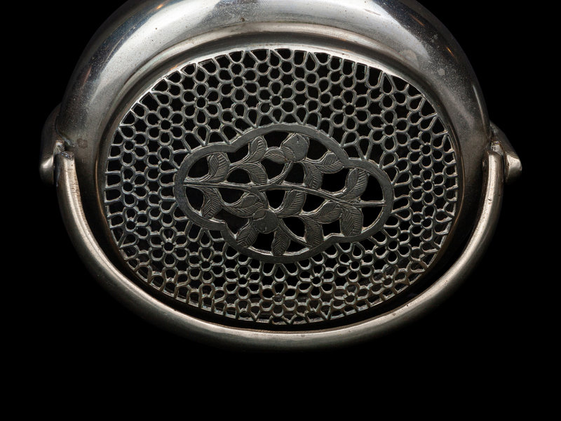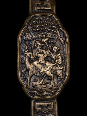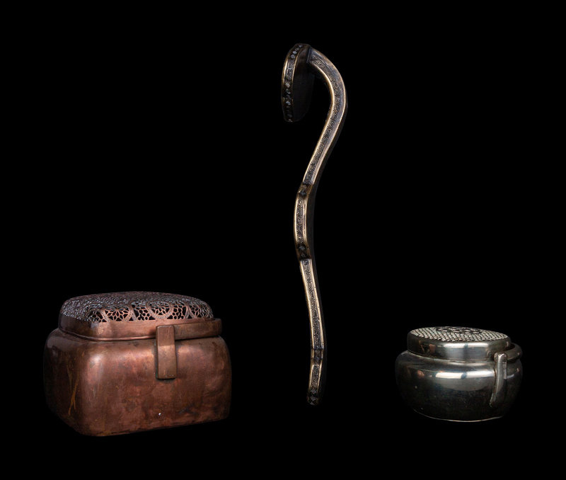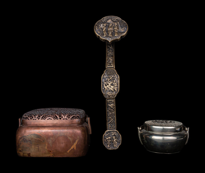 comprising two handwarmers with reticulated covers, and one ruyi scepter cast with immortals at mock-plaques at the terminals and center surrounded by auspicious symbols.
