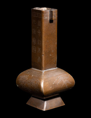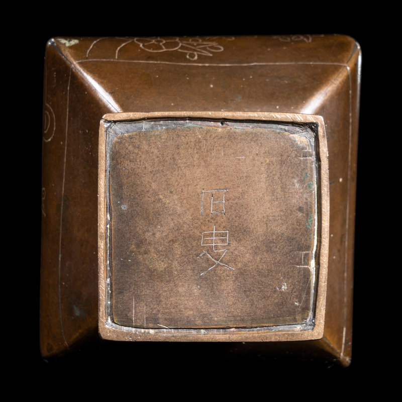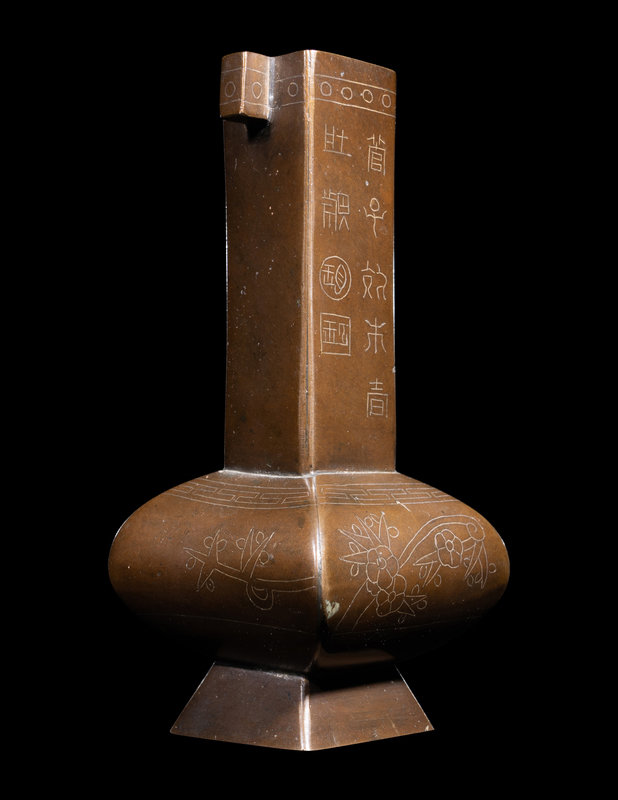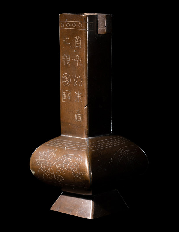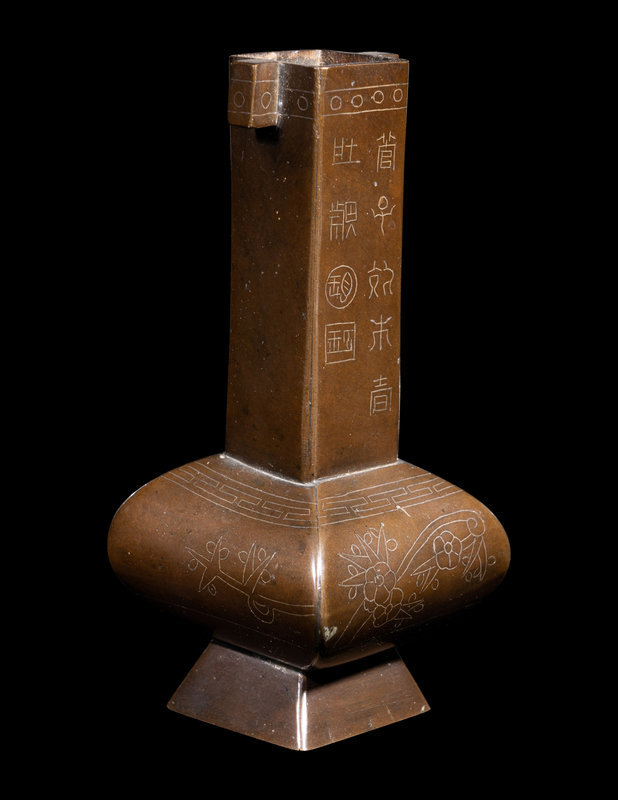 the compressed body rising from a spreading foot to a tall square sectioned neck, a pair of lug-form handles flanking the mouth rim, the neck decorated with silver inlaid inscriptions above flowering prunus branches on the body, the underside bearing a two-character Shi Sou mark.
