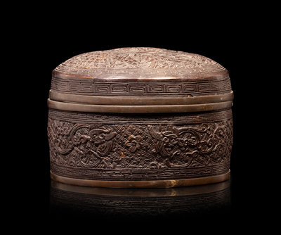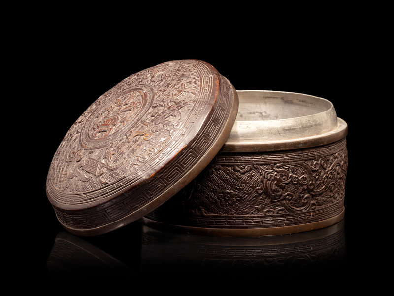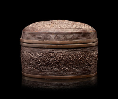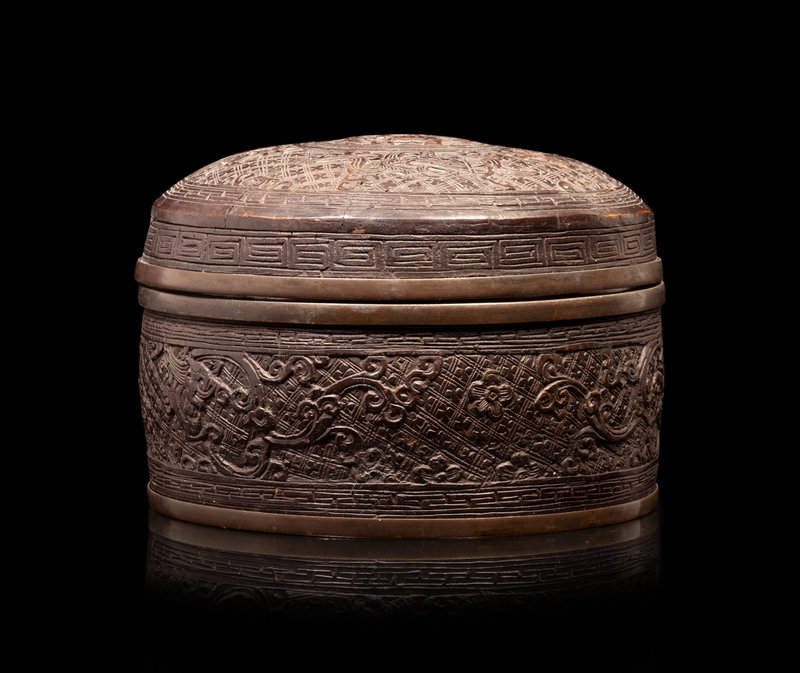 cast in cylindrical form imitating an intricately carved lacquer box, the walls worked with undulating scrolls and flowers against a diaper ground, meeting the domed lip at smooth lips between keyfret bands.