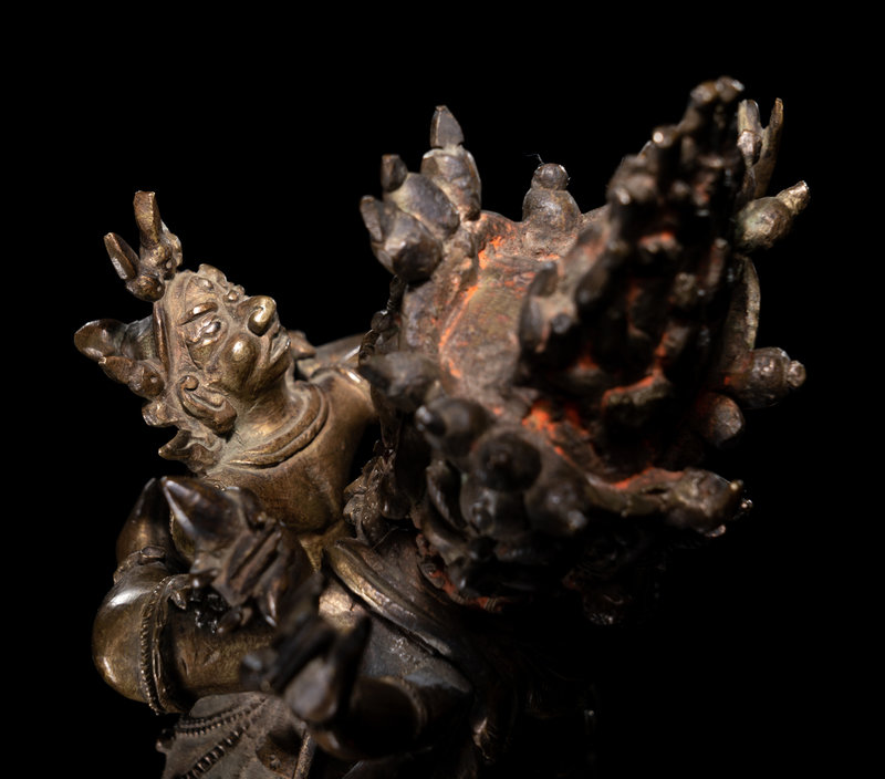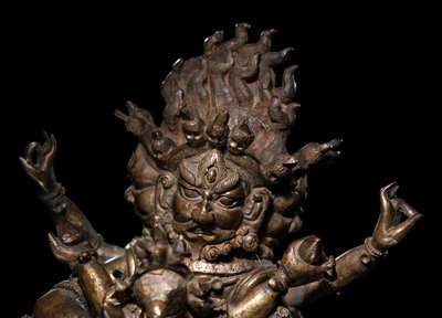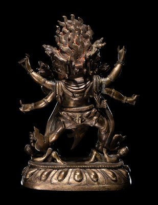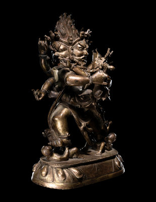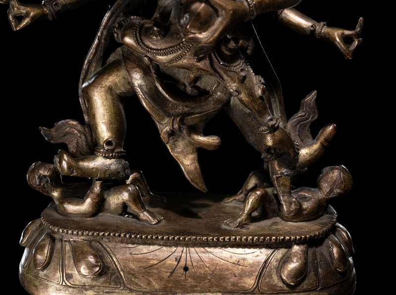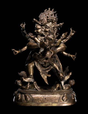the multi-armed wrathful figure depicted standing on two humans, embracing his consort at front.