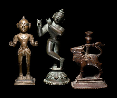 comprising three Indian figures, the first depicting a standing male, the second a musician and the third an ox-form candle holder; together with a bronze figure of seated Buddha.