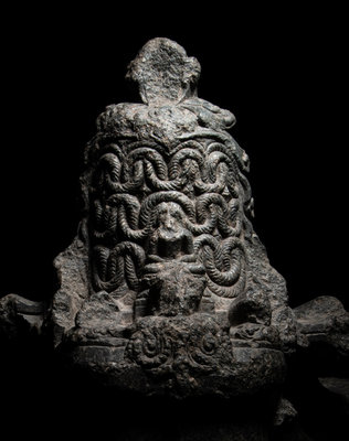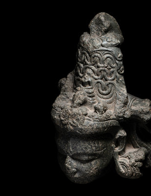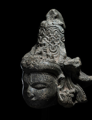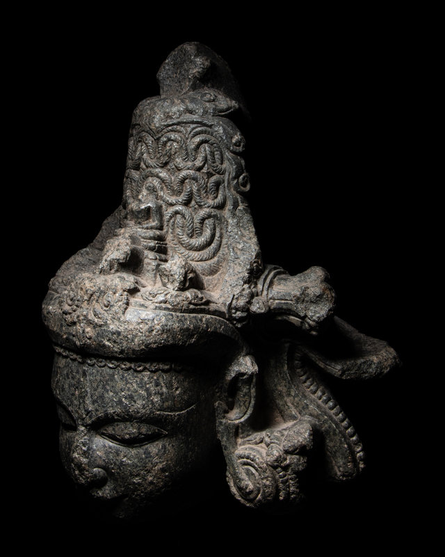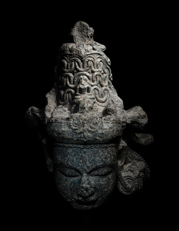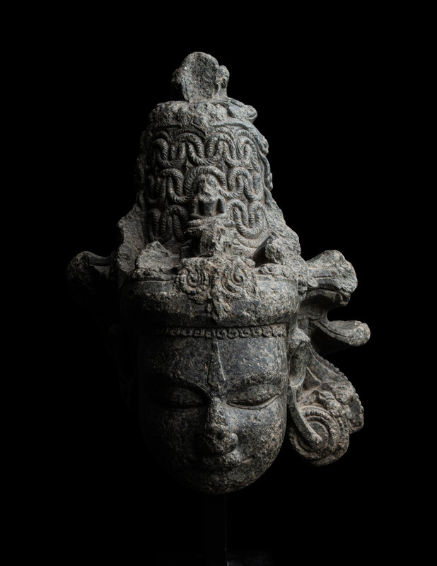 the gently rounded face very finely carved with a benevolent expression, the heavy-lidded eyes beneath sinuous brows centered by a tear-shaped urna, the fine locks of hair in tight curls along the hairline, the stone smoothly polished.