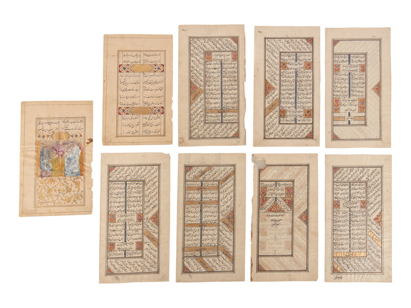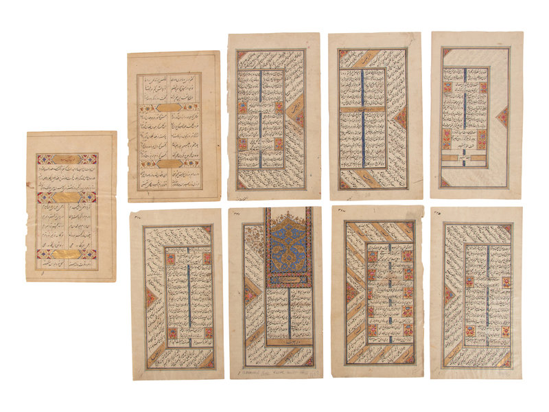 comprising seven leaves from a poetical manuscripts by Sadi, and two manuscripts from another work, all with numerous colored floral ornaments on old, column dividers gold on blue, marginal headings blue on gold, gold and colored borders.