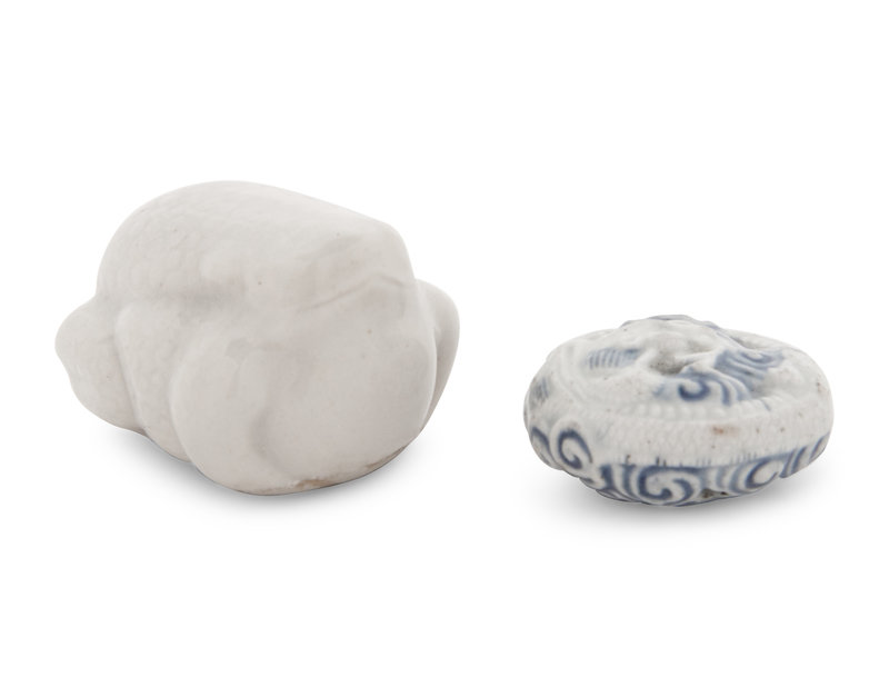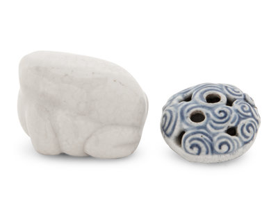the first a white porcelain figure of a toad; the second a reticulated form depicting a dragon encircling blue and white swirling clouds.