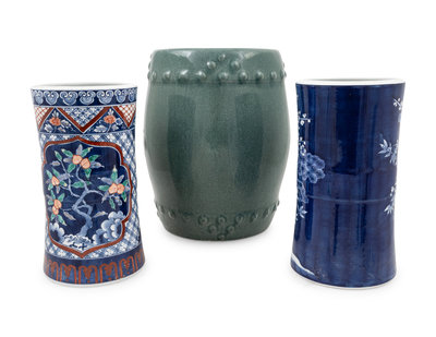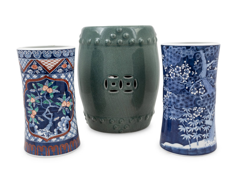 Two Japanese Porcelain Umbrella Stands and A Chinese Celadon Porcelain Barrel-Form Garden Stool