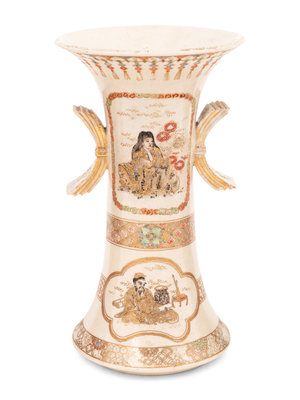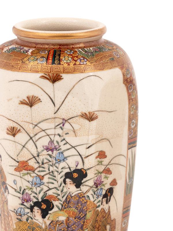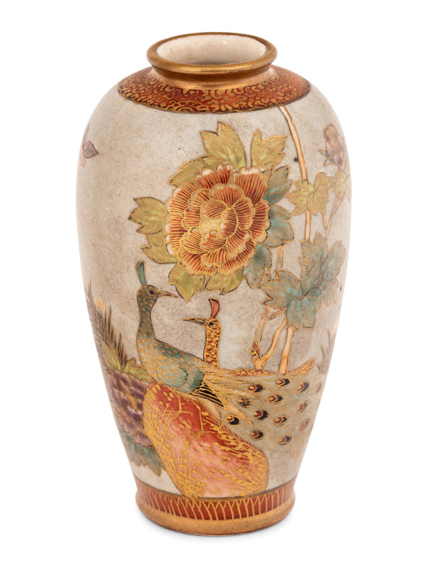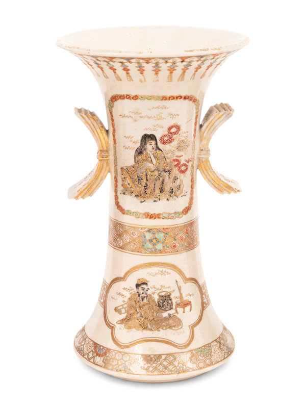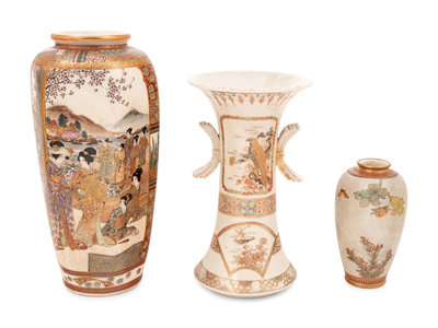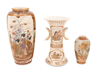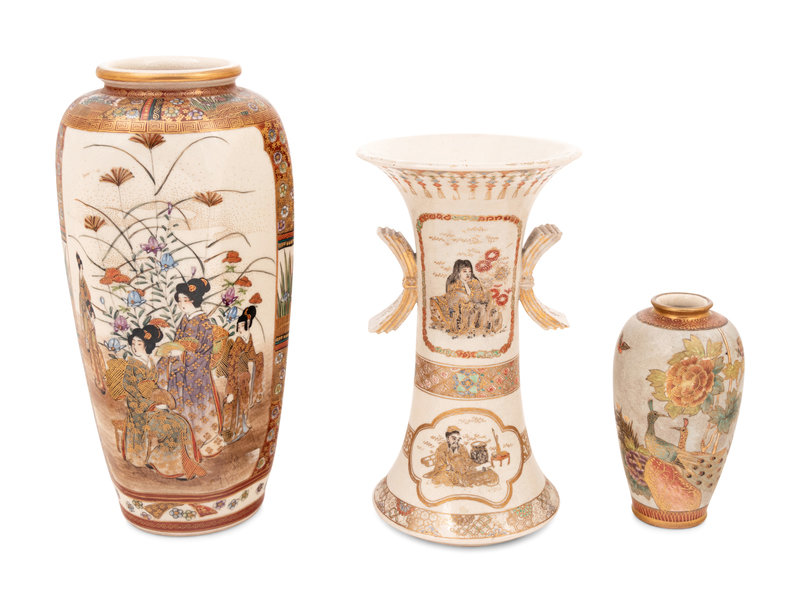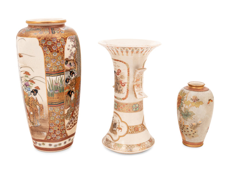 comprising a baluster example decorated with panels showing geisha figures in landscape, the second a beaker-form example with a pair of handles in the form of stacked cloth, painted with shaped windows enclosing figures and birds perched on branches; the third a smaller baluster example depicting peacocks amongst flowers.
