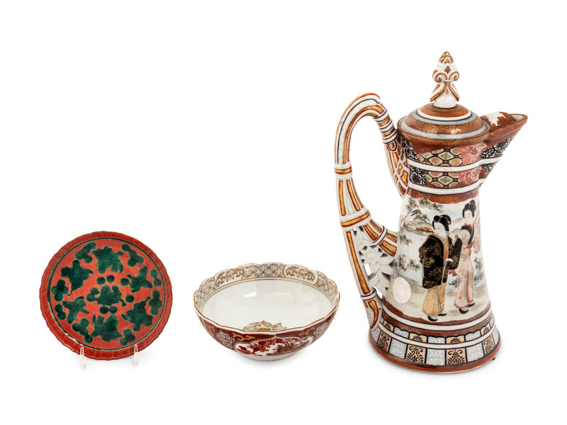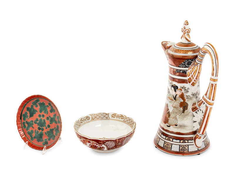 comprising three Kutani bowls, a pair of large Kutani ewers and a Kutani plate.