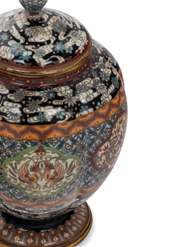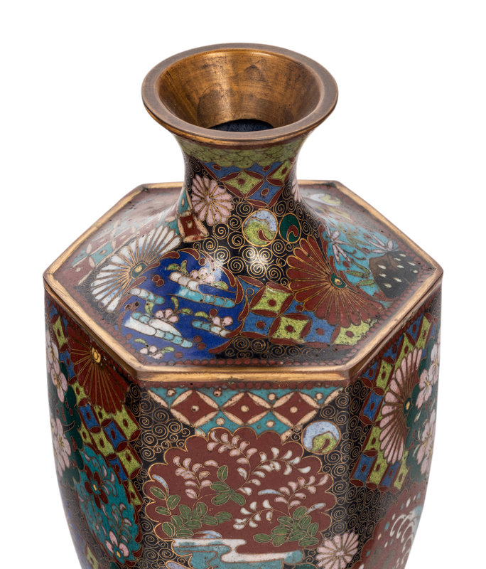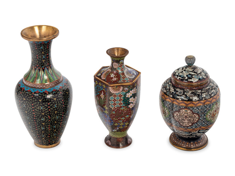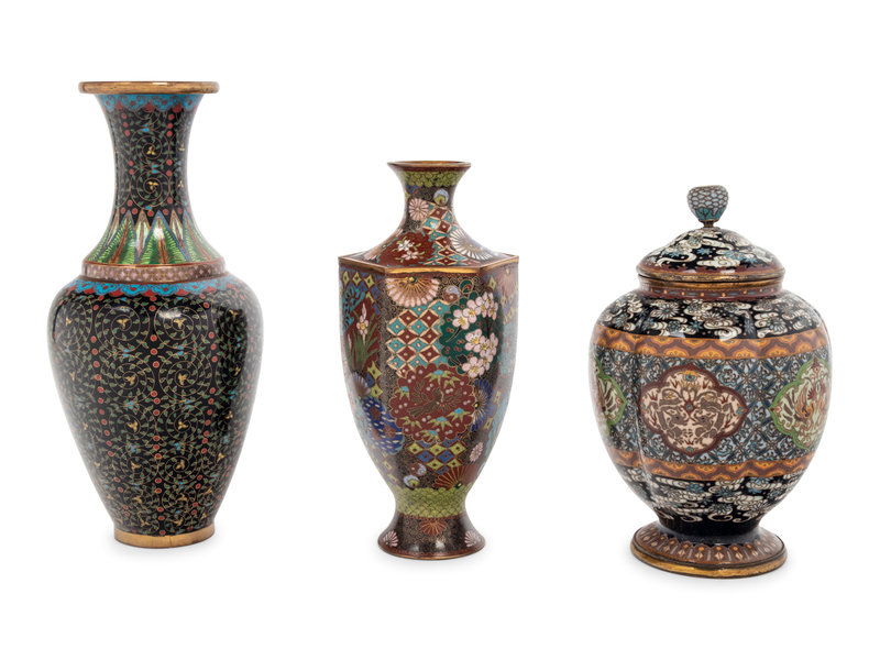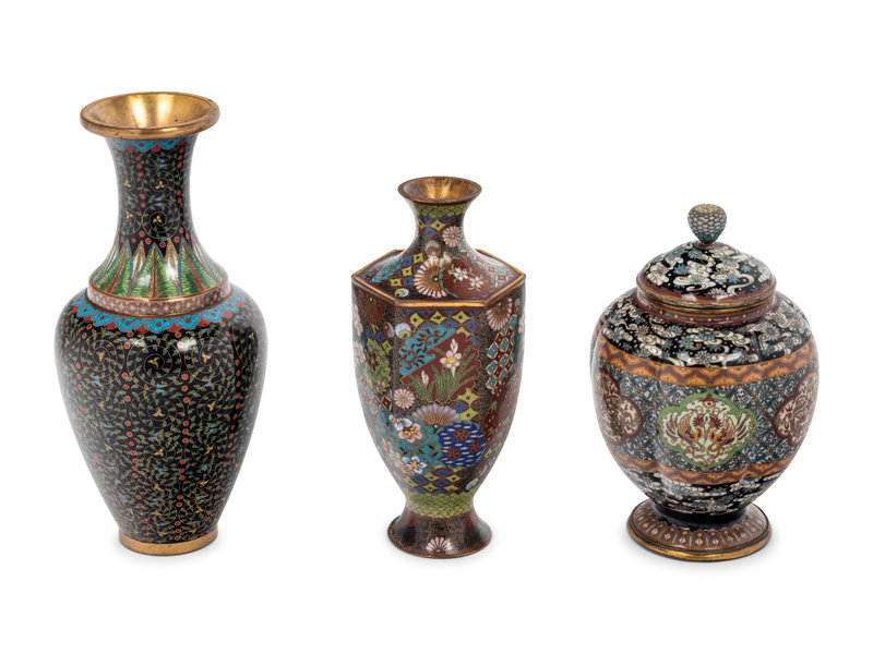 the first a bottle vase, the second a hexagonal vase and the third a covered vase, each with floral decoration.