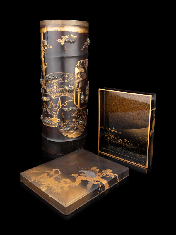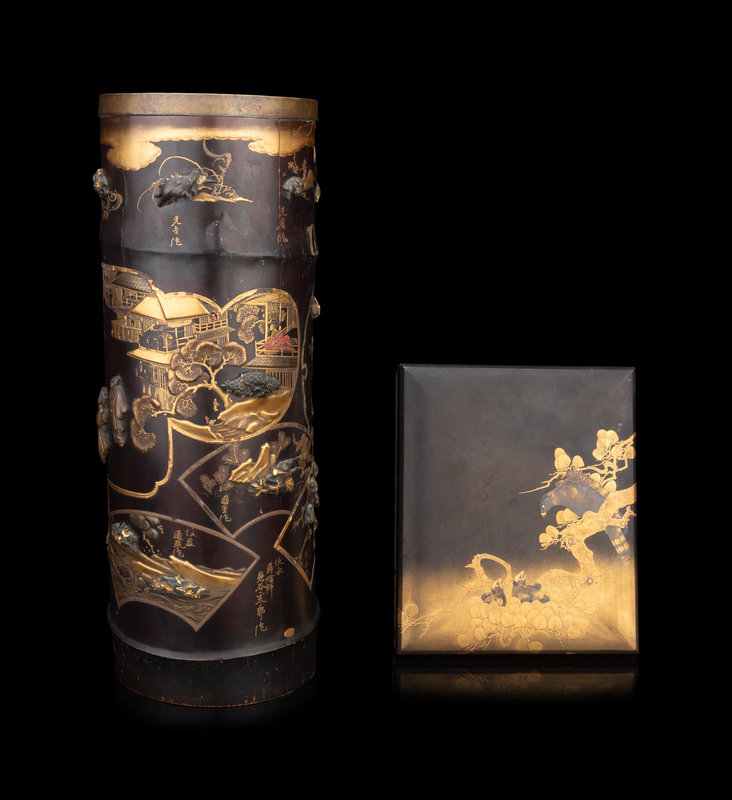 Two Japanese Black Lacquered and Gilt Decorated Articles