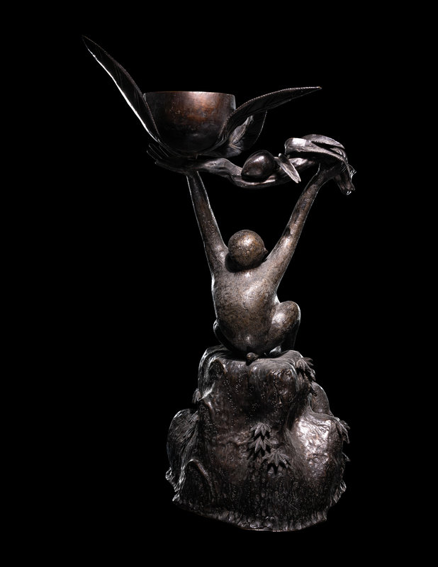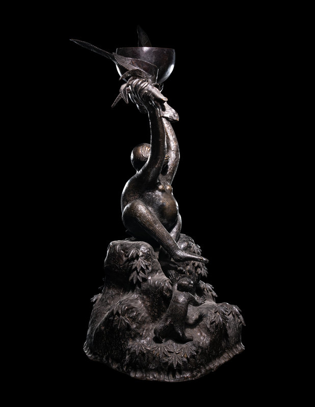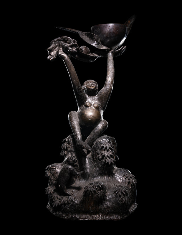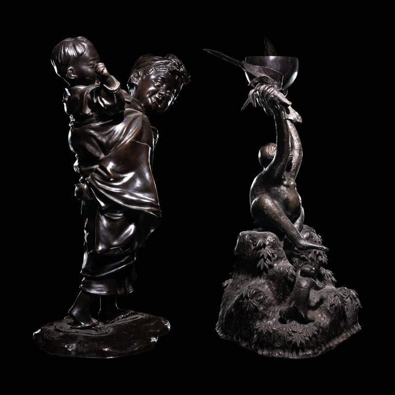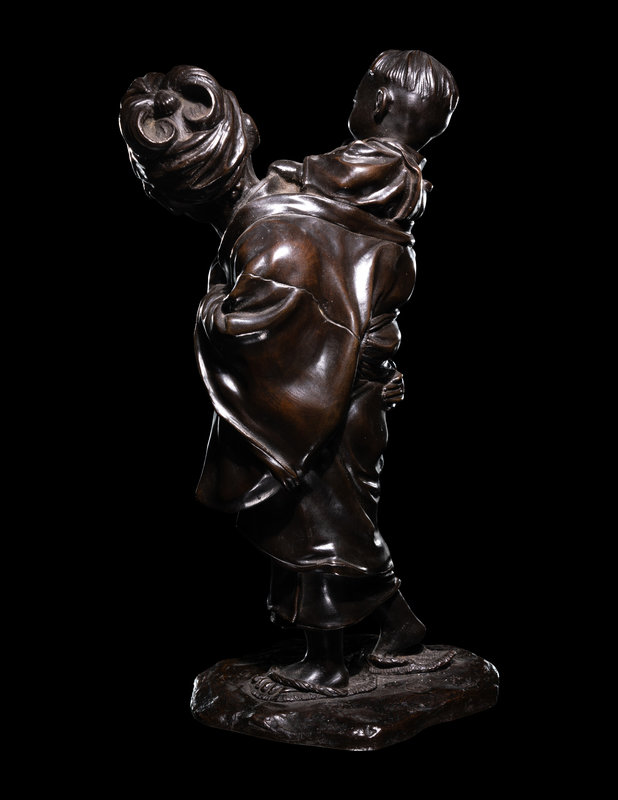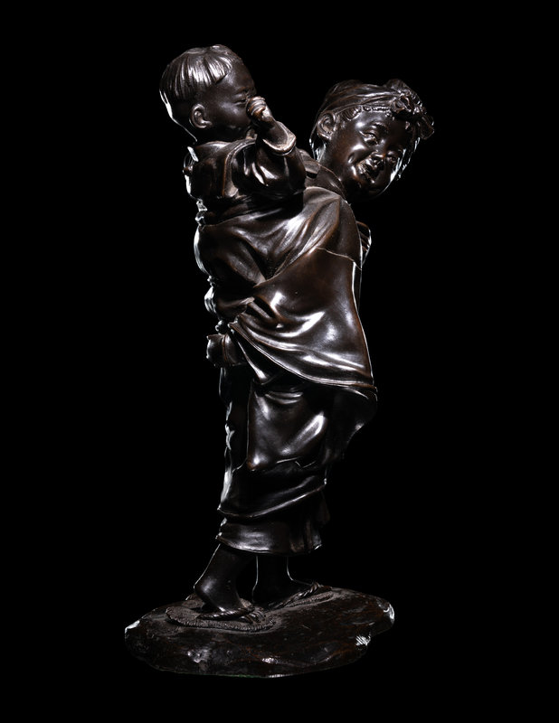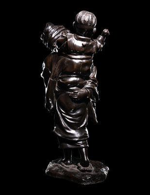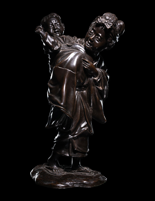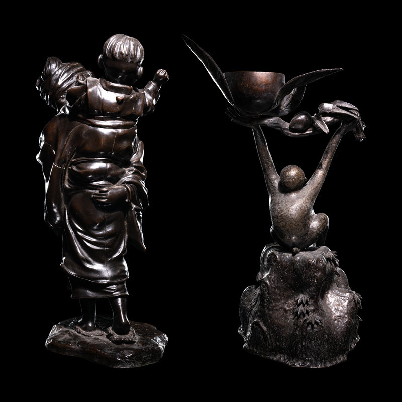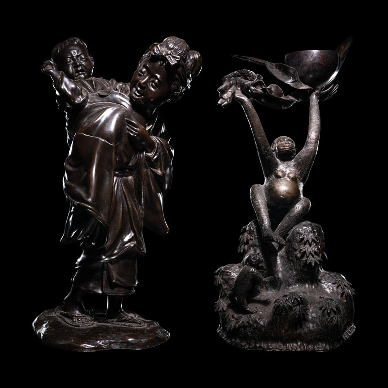 the first showing a mother carrying a child on her back, the second a monkey sitting on rockery, holding a large peach above its head.