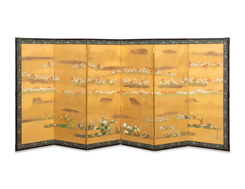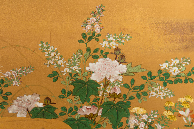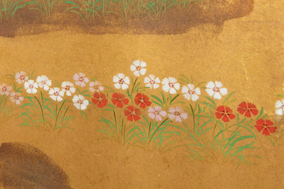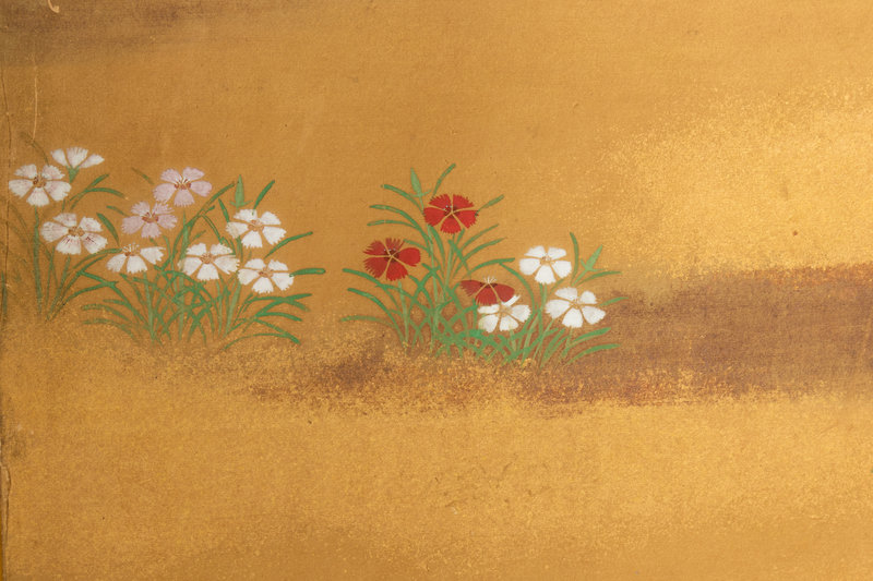 ink and color on gold leaf paper, painted to show flowers, signed with an artist's seal.