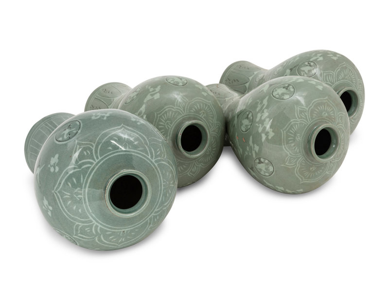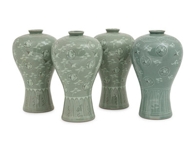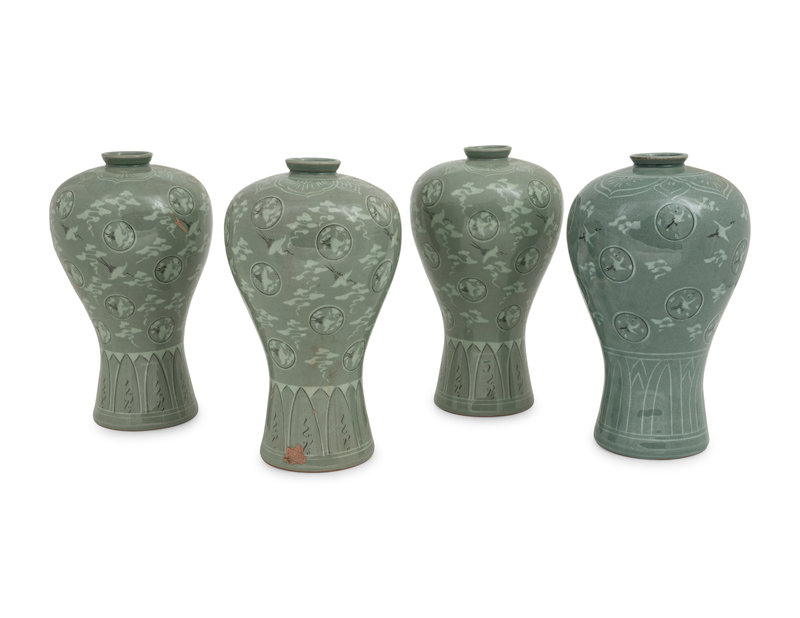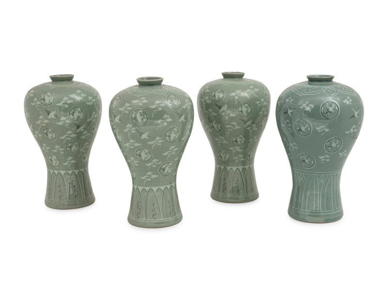 Four Korean Celadon 'Crane and Cloud' Porcelain Maebyong Vases
