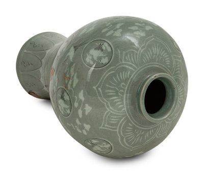 intricately decorated with white cranes and clouds of that presumably float in the "sky" of the celadon glaze, design is common to Korean Goryeo ware from the twelfth century, marks by four different makers.