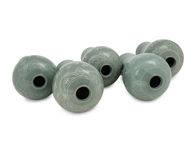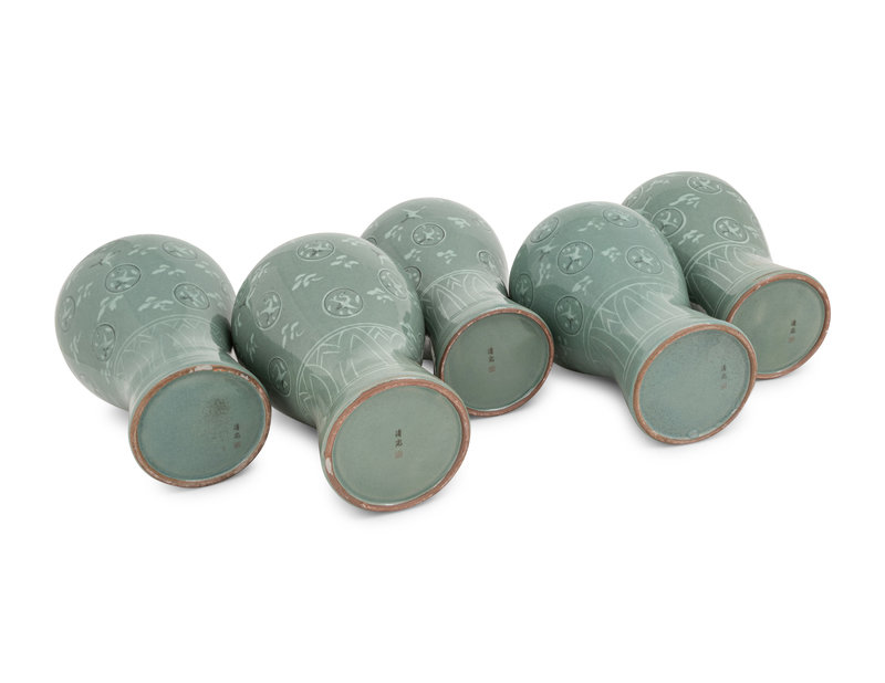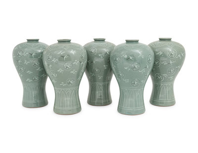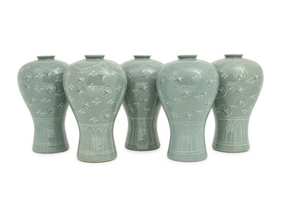Five Korean Celadon Ground Porcelain 'Crane and Cloud' MaeByong Vases