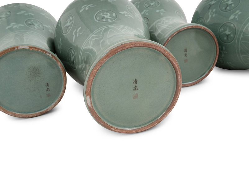 intricately decorated with white cranes and clouds of that presumably float in the "sky" of the celadon glaze, design is common to Korean Goryeo ware from the twelfth century, each signed with a two-character qingguang mark.