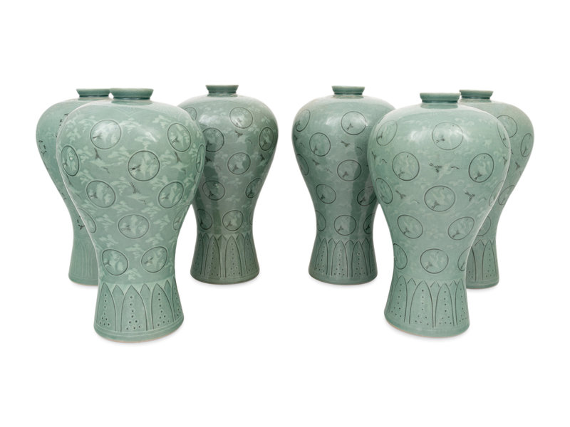 Six Korean Celadon Glazed Porcelain 'Crane and Cloud' Maebyong Vases