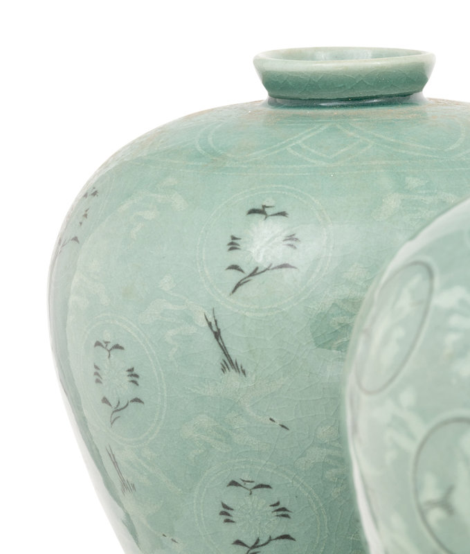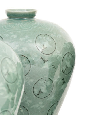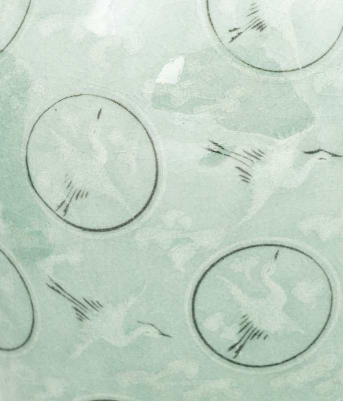 intricately decorated with white cranes and clouds of that presumably float in the "sky" of the celadon glaze, the "thousand cranes" design is common to Korean Goryeo ware from the twelfth century.