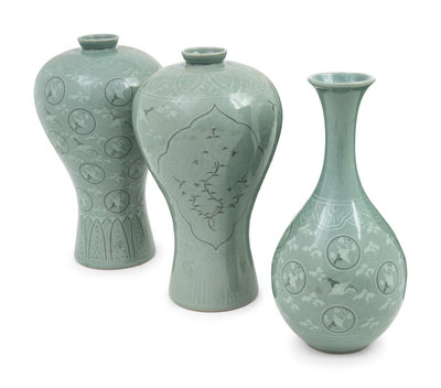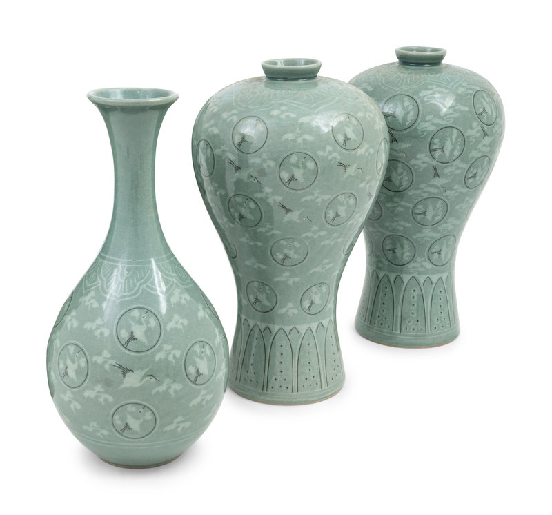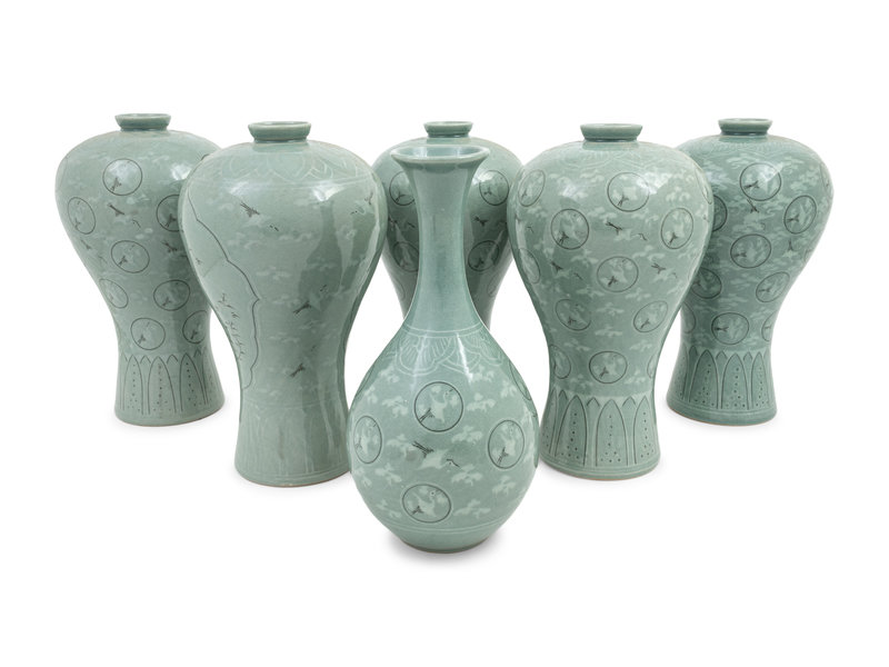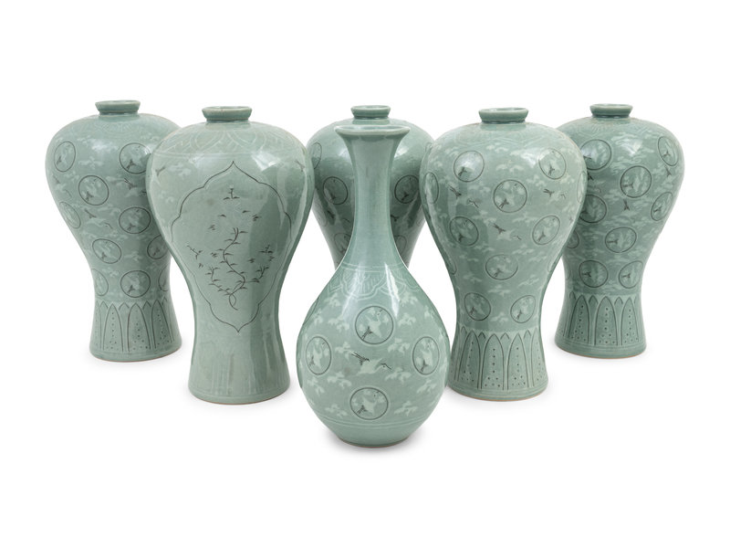Six Korean Celadon Ground 'Crane and Cloud' Vases