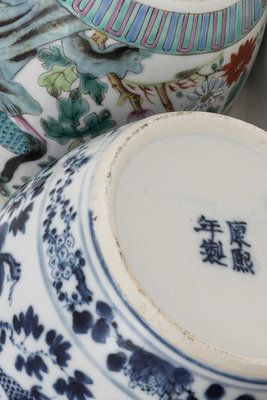 comprising a pair of jars with famille rose decoration, and a small blue and ehite jar.