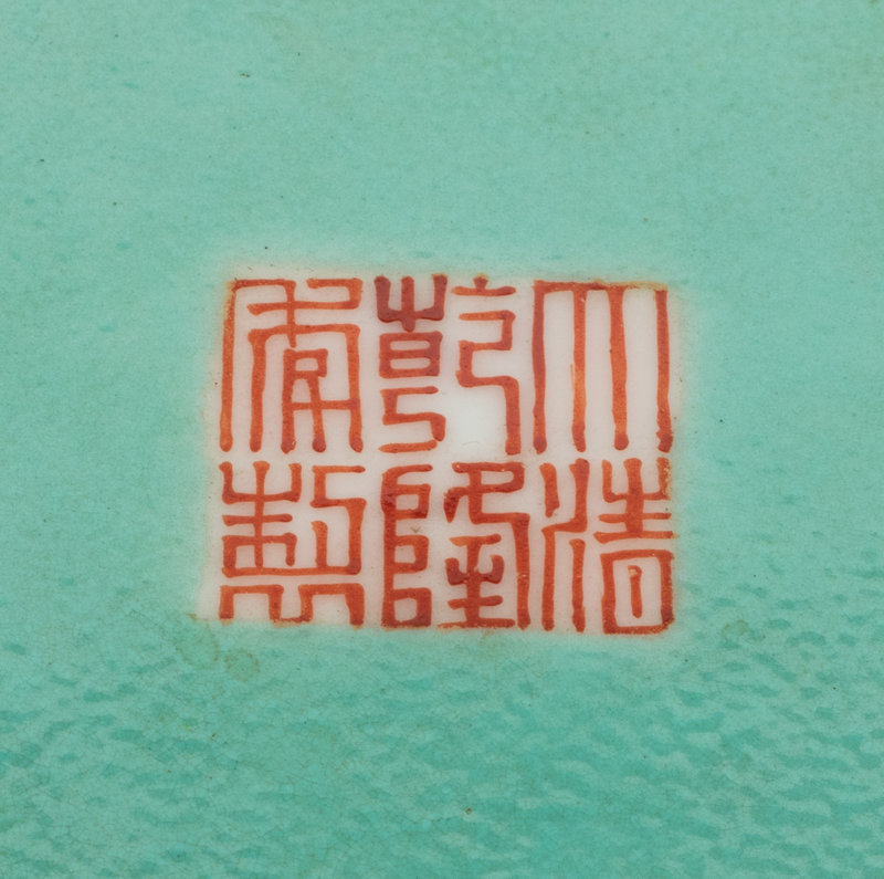 the baluster body resting on a short foot, rising to a flared mouth, the exterior painted with floral blossoms, interlocking coins and grapes borne on meandering vines, all reserved on a dark blue ground, the interior and the underside glazed turquoise, bearing a Qianlong six-character iron red seal mark.