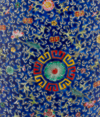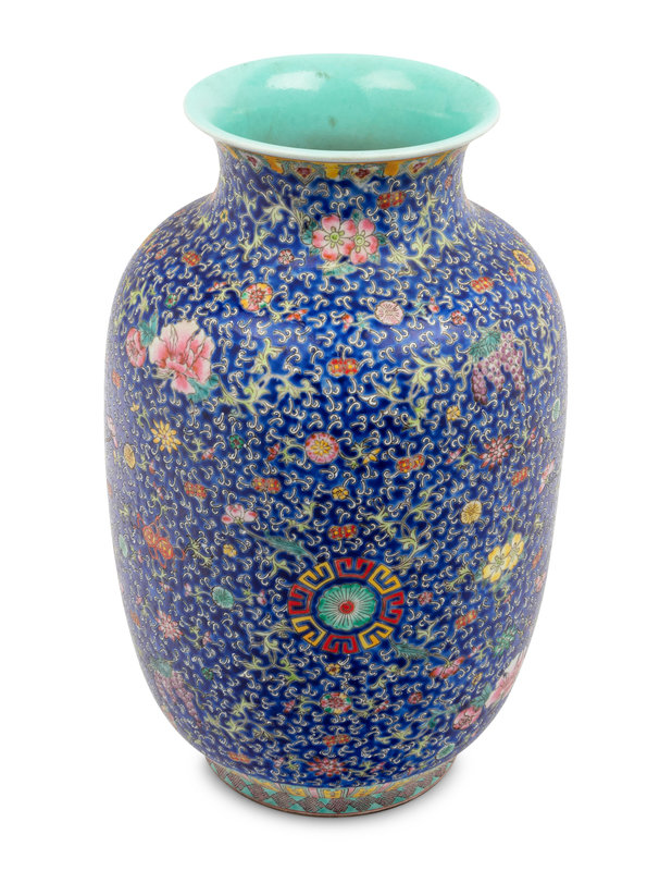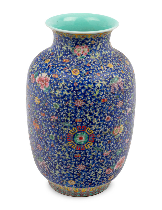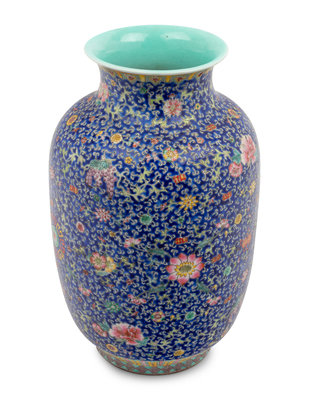 A Chinese Blue Ground Famille Rose Porcelain Baluster Vase