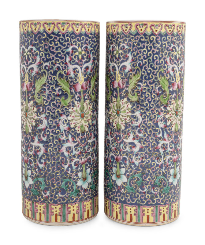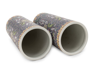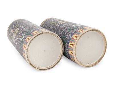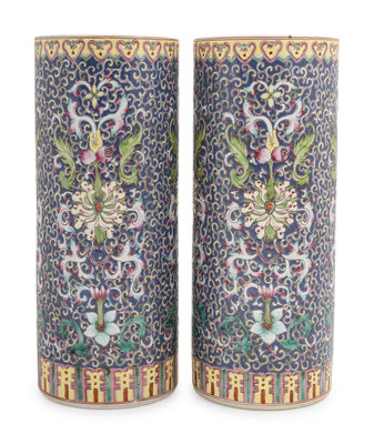 A Pair of Chinese Blue Ground Famille Rose Porcelain Hat Holders