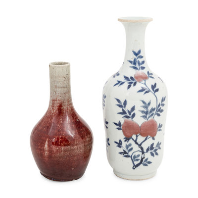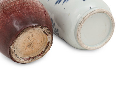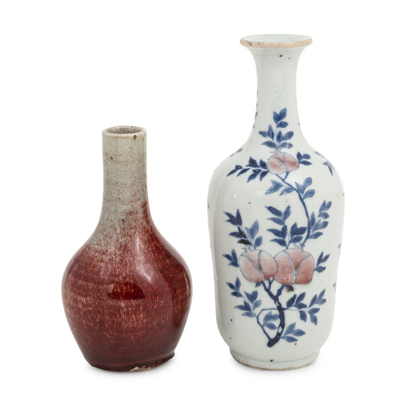 comprising a peach bloom glazed example, and a blue and white and copper red decorated example.