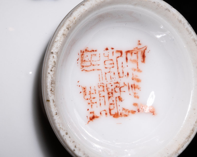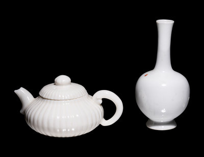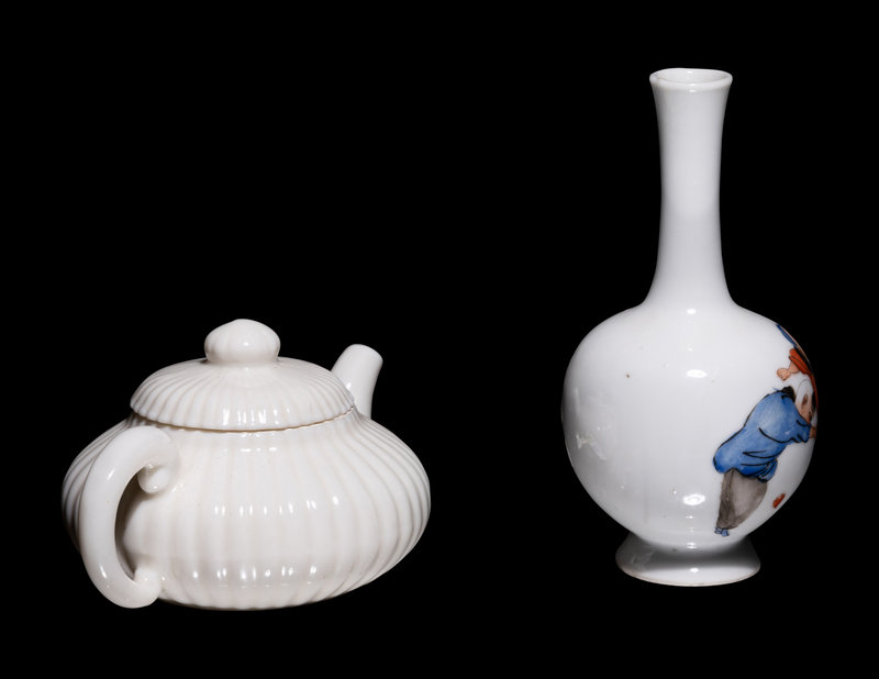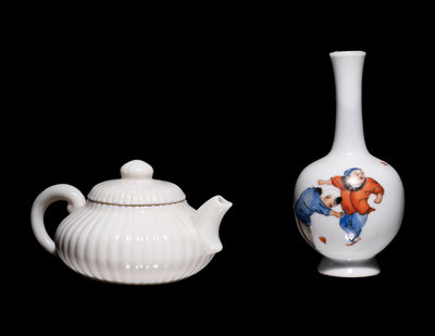 the first a famille rose bottle vase, decorated with children, the underside bearing an apocryphal Qianlong six-character iron red mark to the underside; the second a chrysanthemum-form covered teapot.