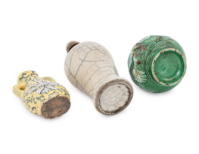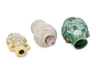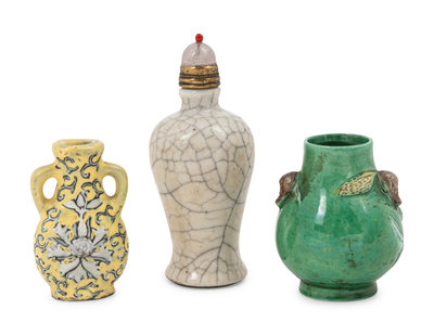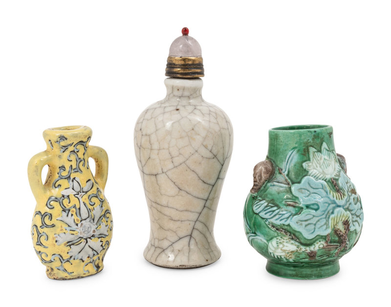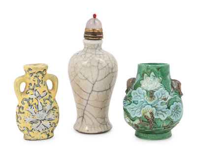 the first a ge-type crackled glazed snuff bottle, the second a yellow ground white and black enameled snuff bottle, the third a green ground fahua-style miniature zun bottle.