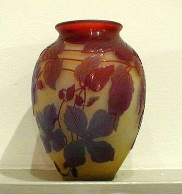 Of bulging form with pinched neck, clematis vine floral motif in shades of purple overlaid on a yellow ground, signed "Galle" in cameo, h: 7.9 in.