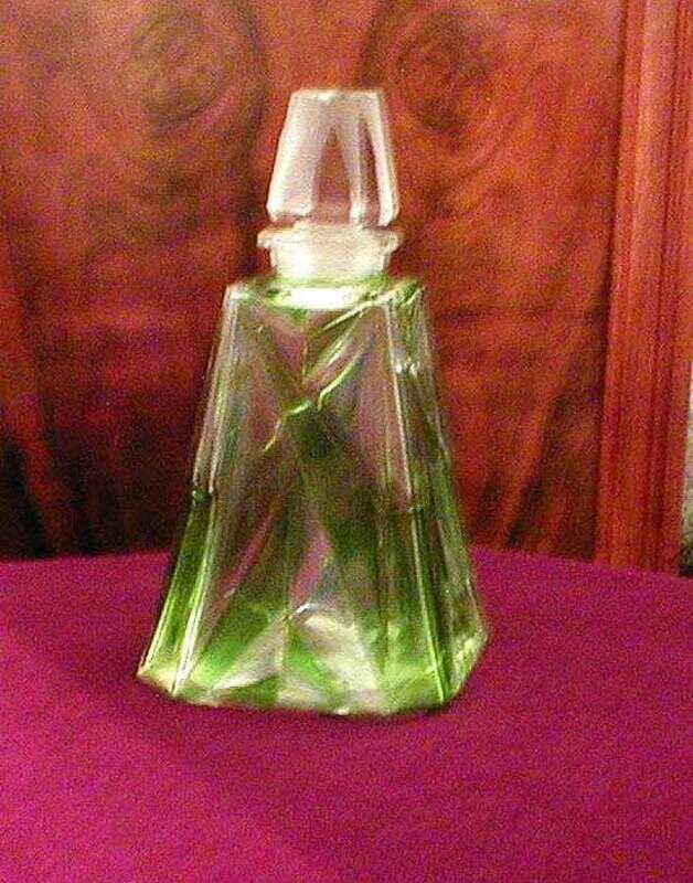 Of more or less triangular form with geometric panels of green over clear glass, faceted stopper, stamped mark, chips to stopper, h: 6.4 in.