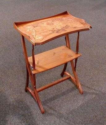 With shaped tray top having floral marquetry and burned signature "L. Majorelle Nancy," a marquetry shelf beneath joined by strapwork legs and organically carved supports, h: 31.3, w: 23.3, d: 15.2 in.