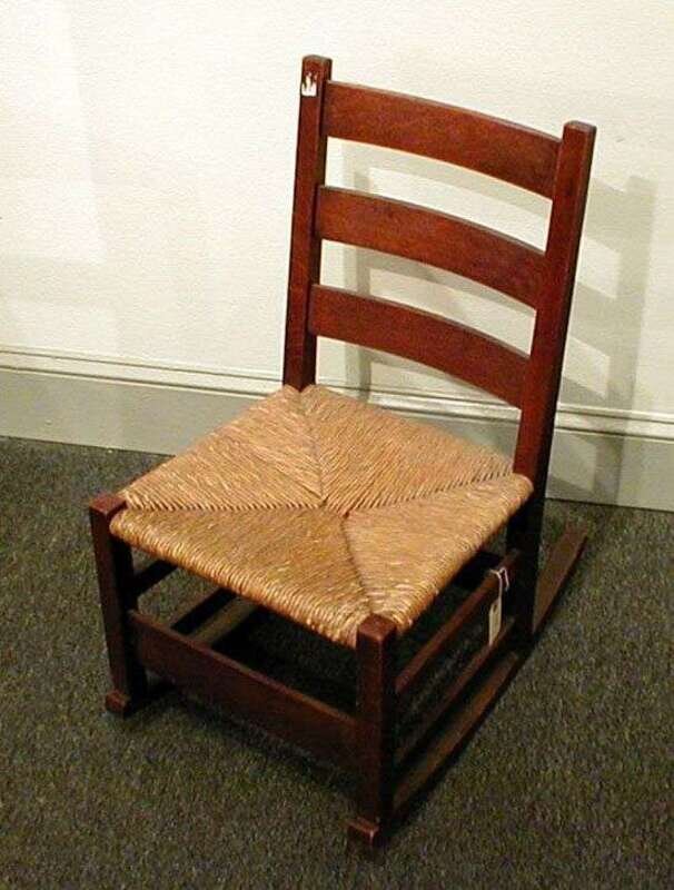 Of fumed quarter-sawn oak with three horizontal slats, rushed seat, boxed red decal and original finish, h: 30 in.