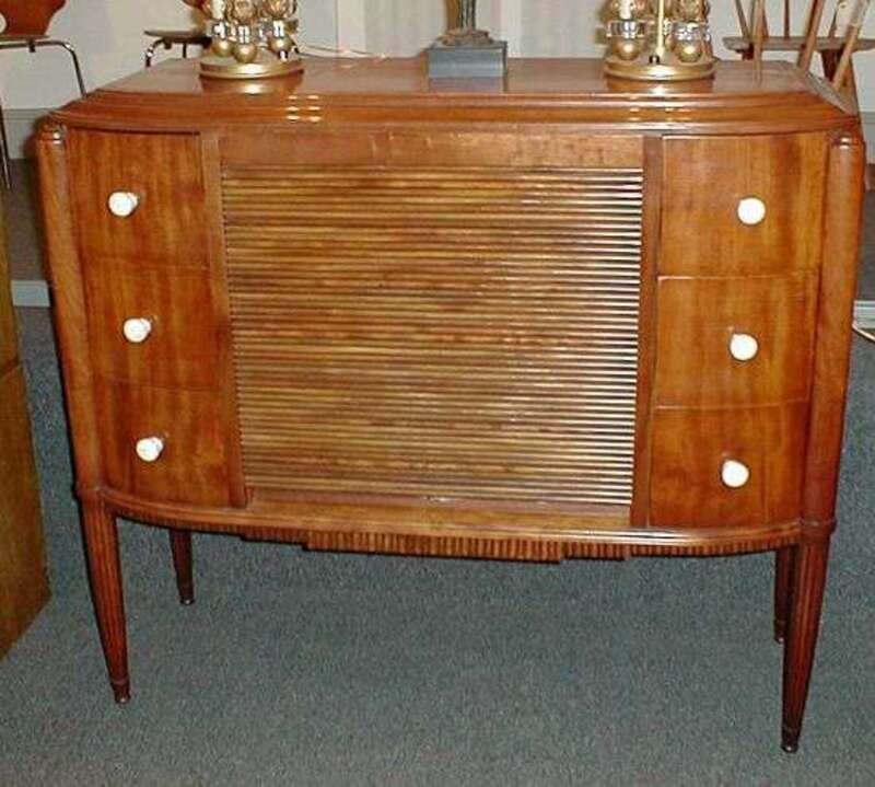 The molded top with curved ends and horizontal tambour section flanked by twin stacks of three drawers each with turned ivory knobs, a ribbed skirt beneath, all on reeded tapering legs, h: 40.6, w: 47, d: 17.3 in.
