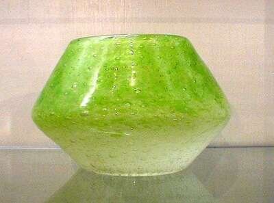 Of flaring form with integral bubbles and color from green to white, drilled base, h: 4.5, dia: 7 in.