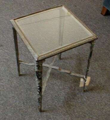 With square beveled glass top set into a stylized frame on four legs cast with monkeys and joined by a stepped "X" stretcher, h: 19.3, top: 13.66 square in.