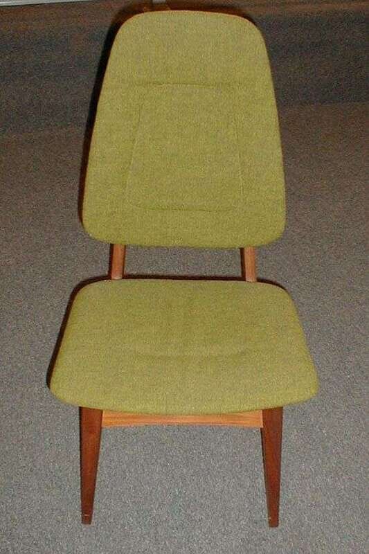 With wooden frames and original green wool upholstered seats and backs, h: 39 in.