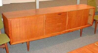 Oblong, with two cabinet doors flanking four drawers, on round tapering legs, h: 31.5, w: 89, d: 17.5 in.